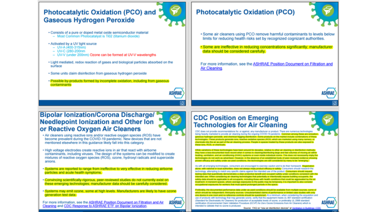 A livello di indirizzi tecnico-regolatori, documenti di EPA e CARB avvertono che i dispositivi possono produrre ozono o altri inquinanti secondari e raccomandano verifiche indipendenti di prestazione e sicurezza; le position statements di ASHRAE richiamano la necessità di prove in edifici reali, con misure di sottoprodotti e limiti alle emissioni.