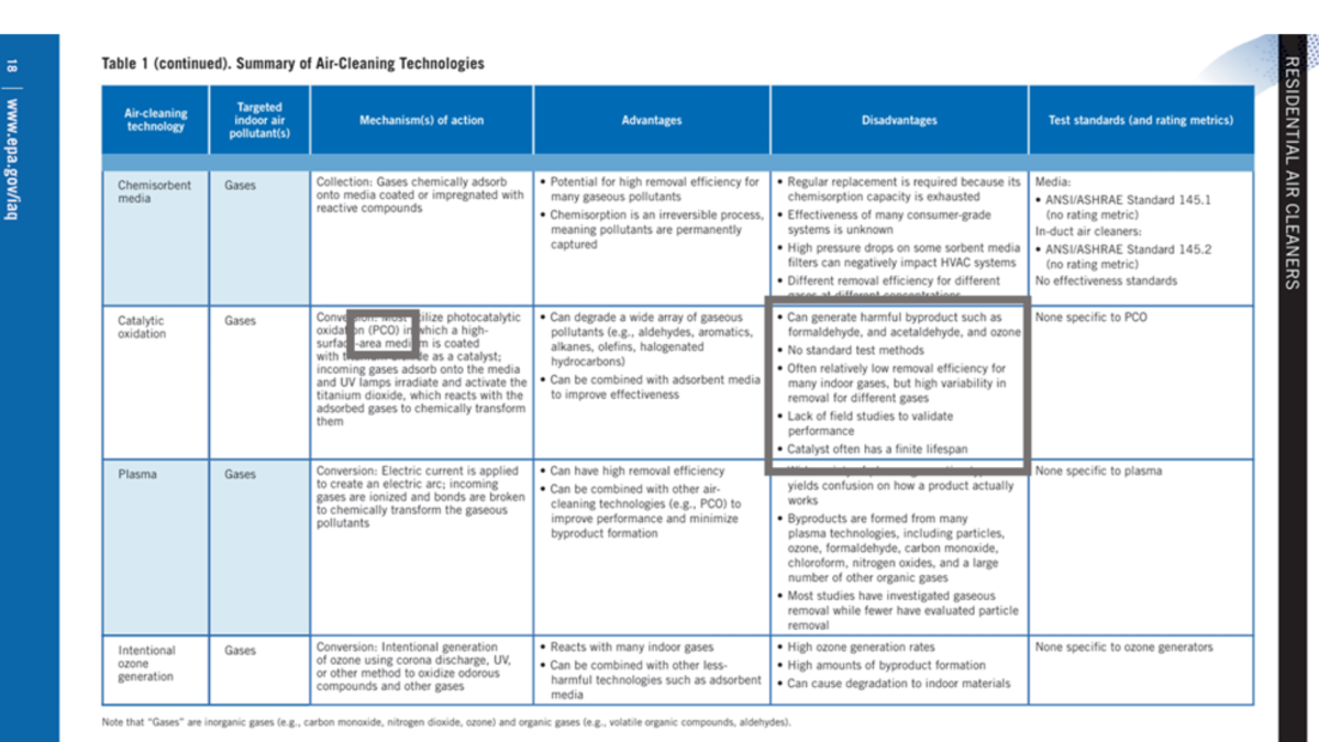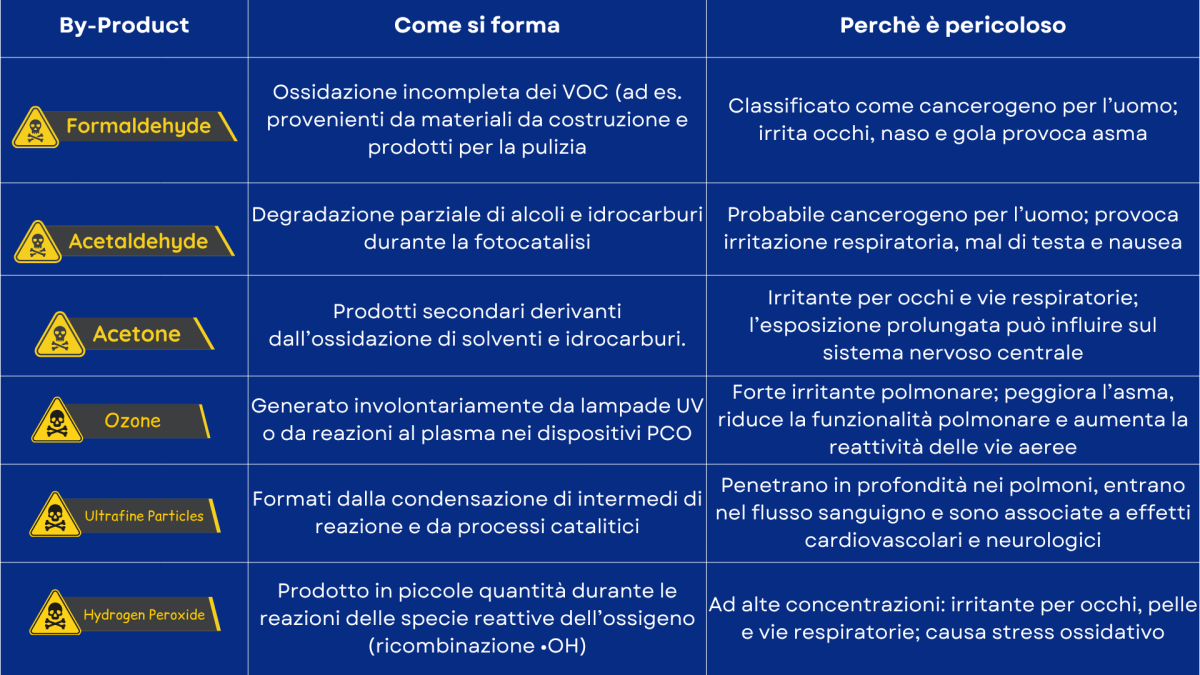 Gli studi indipendenti hanno evidenziato che la tecnologia PCO può produrre sottoprodotti indesiderati, come formaldeide e acetaldeide, soprattutto quando viene utilizzata in condizioni realistiche e con alti flussi d’aria.